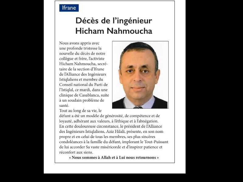 Secrétaire de la section d’Ifrane de l’Alliance des Ingénieurs Istiqlaliens, Hicham Nahmoucha était également membre du Conseil national du Parti de l’Istiqlal. Homme de terrain, militant infatigable, il aura marqué tous ceux qui ont croisé sa route par sa bienveillance, son intégrité et sa profonde humanité.