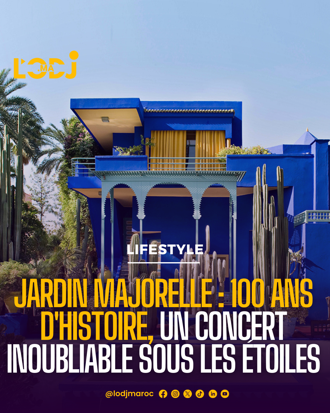 Célébrez les 100 ans du Jardin Majorelle sur la mythique place Jemaa El Fna, le samedi 19 octobre ! Ne manquez pas cette soirée exceptionnelle avec des performances live d'artistes de renom tels qu'Ikram El Abdia, Kawtar Sadiq, Nouaman Belaiachi, et Douzi !