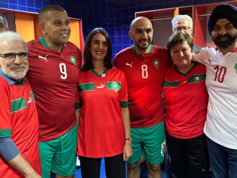 Ce dimanche 8 octobre, en pré-ouverture des assemblées annuelles de la Banque Mondiale et du FMI, la Fédération Royale Marocaine de Football (FRMF) a organisé deux rencontres amicales de football qui ont réuni d’anciens joueurs marocains des équipes nationales masculines et féminines et deux équipes mixtes formées par le personnel de la BM et du FMI au grand stade de Marrakech !