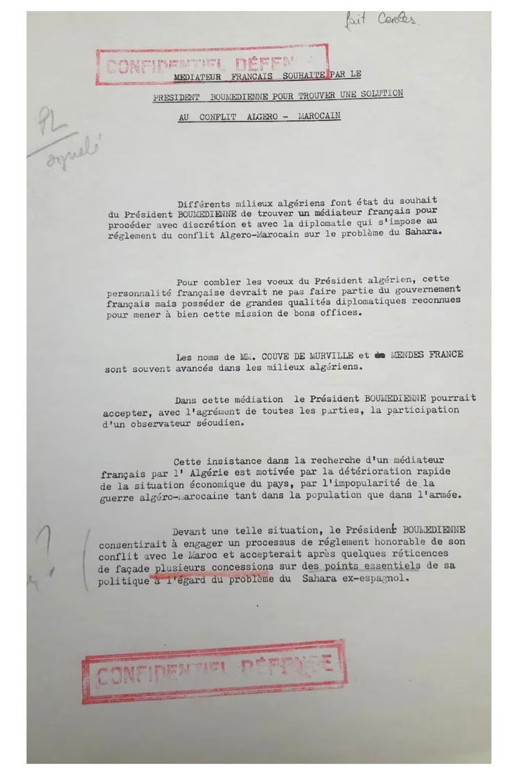 Les archives diplomatiques françaises, classées «Confidentiel défense», révèlent l’ampleur de cette tentative de sortie de crise. Un document parlant s’intitule: «Médiateur français souhaité par le président Boumediene pour trouver une solution au conflit algéro-marocain».