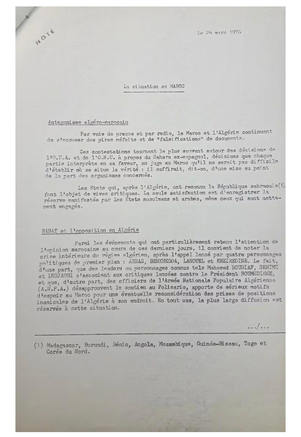 «Parmi les événements qui ont particulièrement retenu l’attention de l’opinion marocaine au cours de ces derniers jours, il convient de noter la crise intérieure du régime algérien, après l’appel lancé par quatre personnages politiques de premier plan: Abbes, Benkhadda, Lahouel et Kheiredine. Le fait, d’une part, que des leaders ou personnages connus tels Mohamed Boudiaf, Sehimi et Ledjaoui s’associent aux critiques lancées contre le président Boumediene, et que, d’autre part, des officiers de l’Armée nationale populaire algérienne (ANPA) désapprouvent le soutien au Polisario, apporte de sérieux motifs d’espoir au Maroc pour une éventuelle reconsidération des prises de position inamicales de l’Algérie à son endroit. En tout cas, la plus large diffusion est réservée à cette situation.» (Note diplomatique émanant de l’ambassade de France à Alger, datée du 26 mars 1976. Archives de La Courneuve, Maroc-Algérie Sahara occidental, 1976, Carton 943)