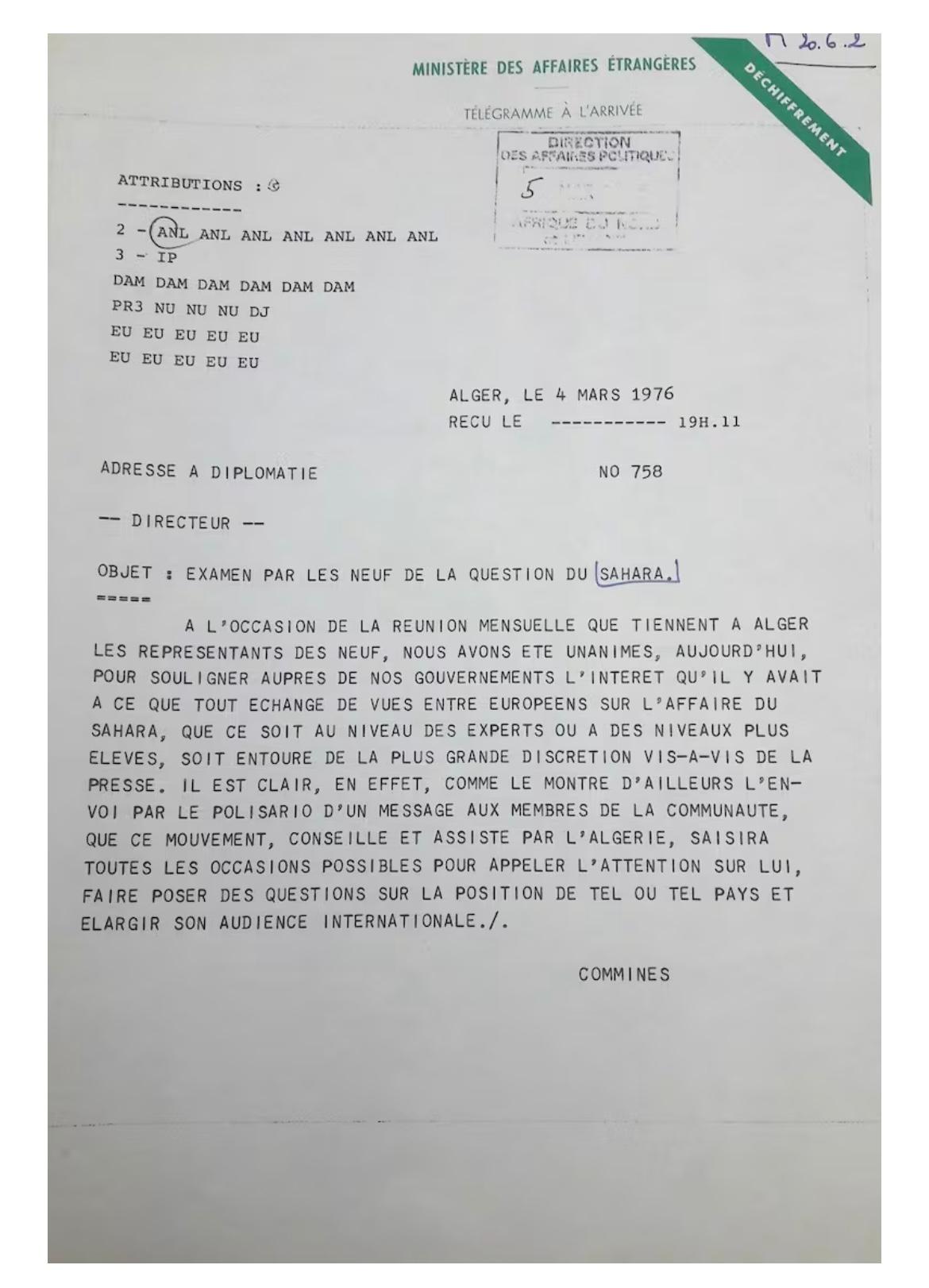 «À l’occasion de la réunion mensuelle que tiennent à Alger les représentants des Neuf, nous avons été unanimes, aujourd’hui, pour souligner auprès de nos gouvernements l’intérêt qu’il y avait à ce que tout échange de vues entre Européens sur l’affaire du Sahara, que ce soit au niveau des experts ou à des niveaux plus élevés, soit entouré de la plus grande discrétion vis-à-vis de la presse. Il est clair, en effet, comme le montre d’ailleurs l’envoi par le Polisario d’un message aux membres de la communauté, que ce mouvement, conseillé et assisté par l’Algérie, saisira toutes les occasions possibles pour appeler l’attention sur lui, faire poser des questions sur la position de tel ou tel pays et élargir son audience internationale.» («Examen par les Neuf de la question du Sahara», Note diplomatique de Guy de Commines. Archives de La Courneuve, Maroc-Algérie Sahara occidental, 1976, Carton 943)