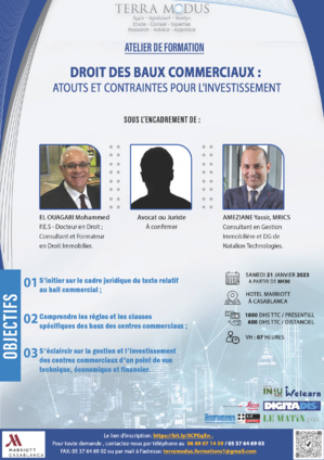 Afin d’apporter un éclairage sur le cadre juridique relatif au bail commercial, comprendre les clauses spécifiques et clarifier la gestion et l’investissement des baux commerciaux, Terra Modus organise un atelier de formation qui aura lieu le samedi 21 Janvier 2023 à L’Hôtel Marriott Casablanca sous le thème : « Droit des Baux Commerciaux : Atouts et Contraintes pour l’Investissement ».