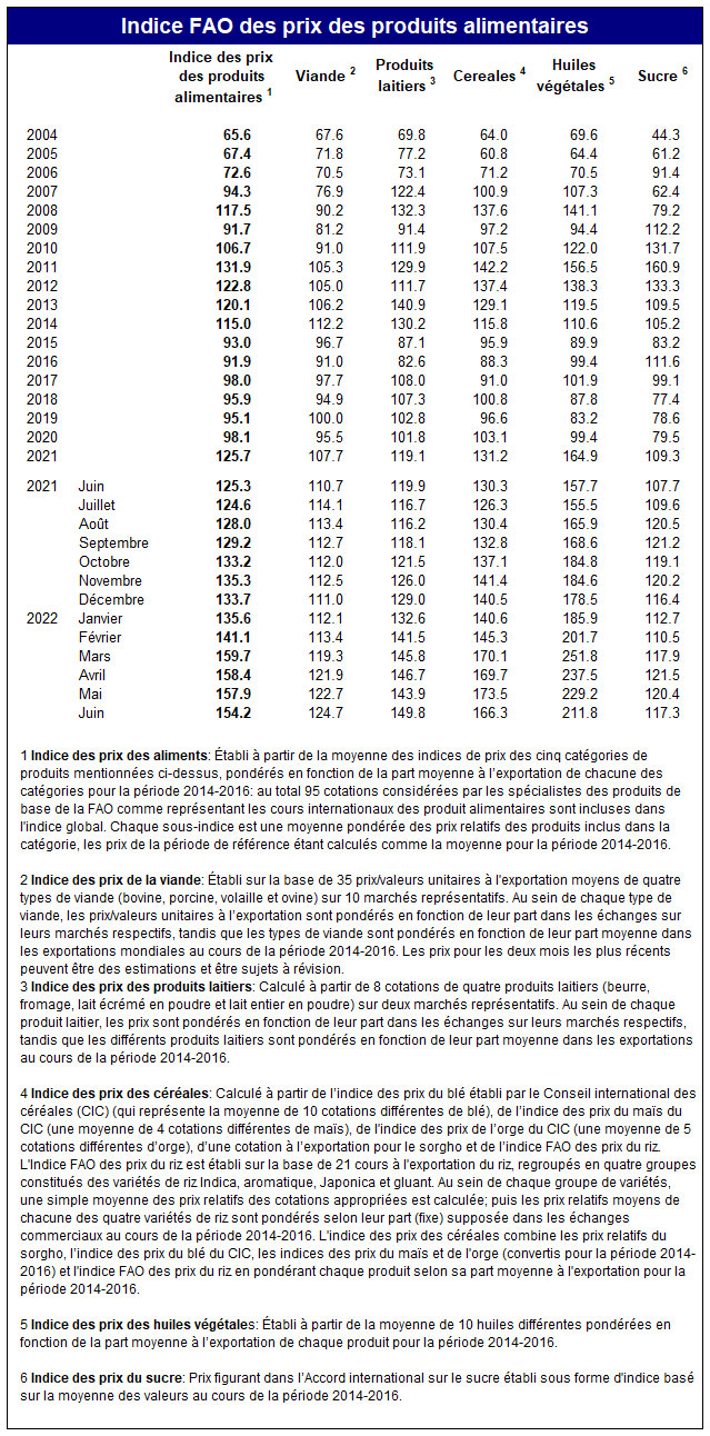 Il s’est établi en moyenne à 154,2 points en juin 2022, soit 3,7 points (2,3 pour cent) de moins qu’en mai. Il s’agit de la troisième baisse mensuelle d’affilée de l’indice, dont la valeur demeure toutefois supérieure de 29,0 points (23,1 pour cent) à celle de l’année dernière. Le recul enregistré en juin s’explique par la baisse des prix internationaux des huiles végétales, des céréales et du sucre; les prix des produits laitiers et de la viande se sont en revanche affermis.