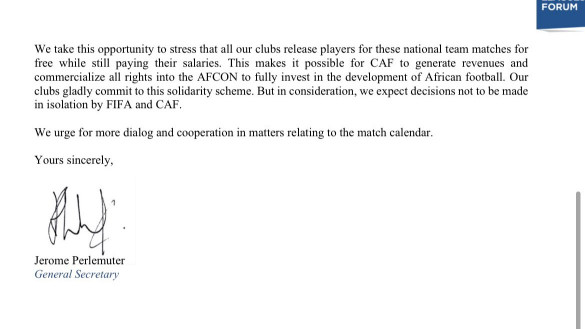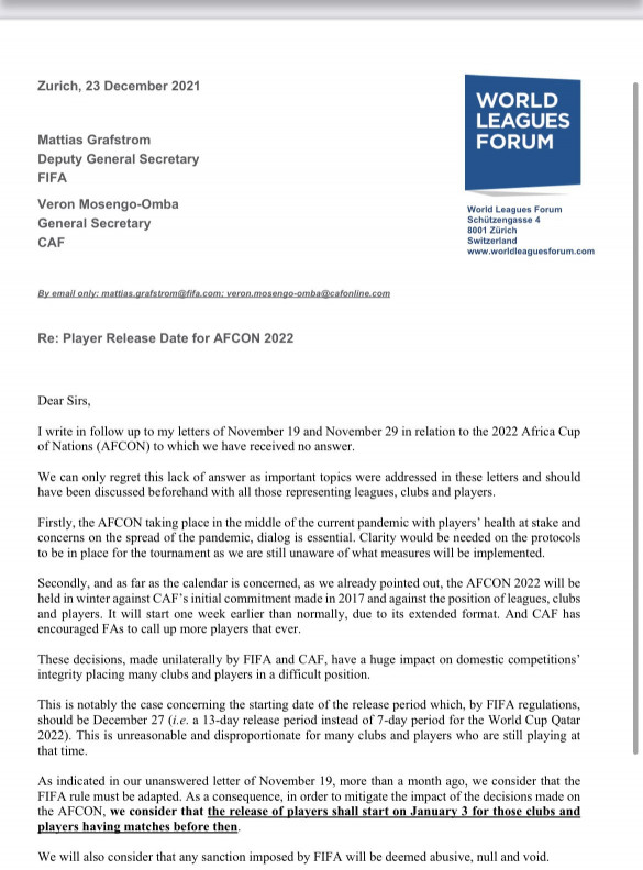 Dans sa lettre co-adressée au secrétaire général adjoint de la FIFA, Mattias Grafström, et au secrétaire général de la CAF, Veron Mosengo-Omba, l’organisation, qui représente plus de 40 ligues professionnelles – dont la France, l’Allemagne, l’Angleterre, l’Espagne ou l’Italie, assure avoir écrit déjà par deux fois à la FIFA et à la CAF le mois dernier, sans recevoir de réponse.