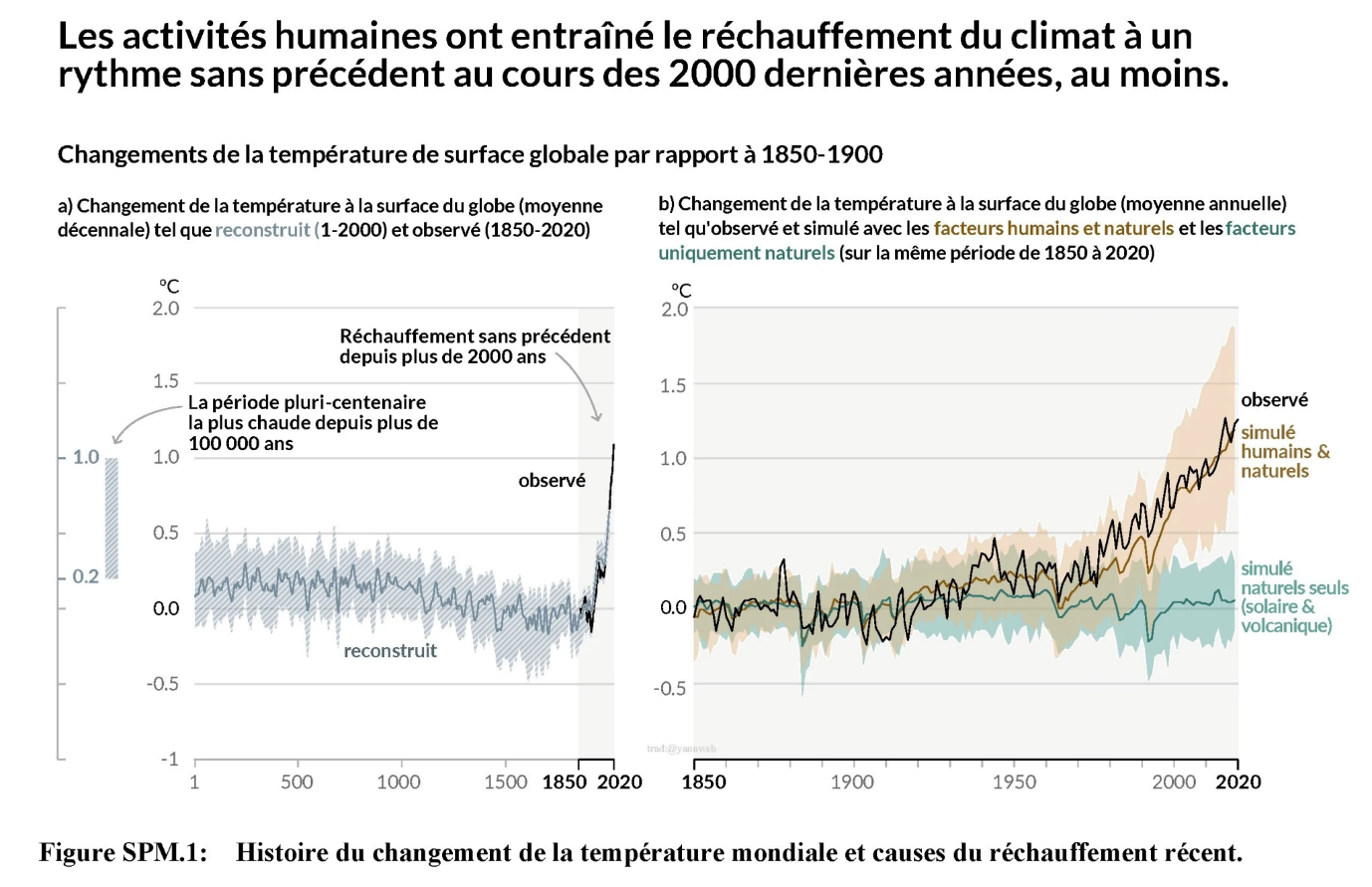 Cependant si l’on se réfère aux dernières conclusions du rapport d’évaluation des Changements Climatiques publiés récemment par le GIEC( Groupe Intergouvernemental sur l’Evolution du Climat), encadré ci après, les canicules qu’on a expérimenté ces deux premières décennie de ce siècle (figure de droite) peut être attribués à un changement persistant du climat qui ne peut s’expliquer que par l’augmentation des émissions des Gaz à effet de Serre (figure de gauche).