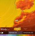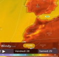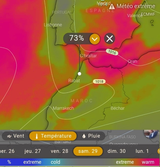 Les prévisions du modèle Européen des phénomènes extrêmes montre que cette vague de chaleur est effectivement un phénomène exceptionnelle avec une probabilité de 99% sur les régions Nod du Maroc et Sud de l’Espagne (zone en rose sur les captures d’écran du site windy.com). La fin de la canicule es le retour à la normale saisonnière des températures est annoncé pour Samedi 29 Avril 2023 (carte de droite).