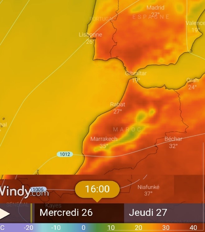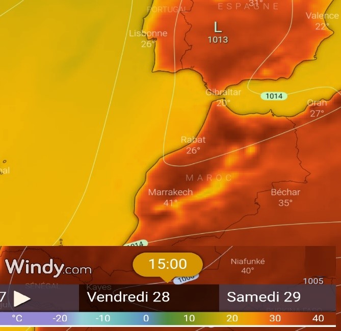 Les prévisions du Centre Européen de prévision annoncent cette canicule à partir de Mercredi avec des températures qui dépasseront les 40 °C dans certaines régions continentales. Le maximum de cette canicule est prévu pour le Jeudi 27 et et Vendredi 28 Avril comme montré par ces captures d’écran des régions Nord du Maroc et Sud de l’Espagne obtenues depuis le site météorologique Windy.com.