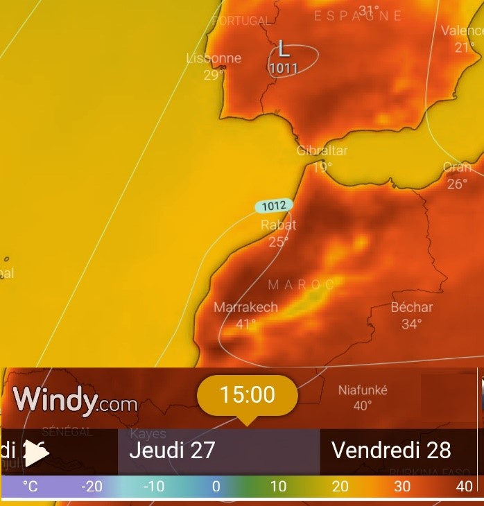 Notre pays , mitoyen au sud de l’Espagne, serait également proie à cette canicule annoncée par la Météorologie Espagnole car cette masse d’air qui vient par le Sud traversera d’abord le Maroc et aura les mêmes effets avec des températures dépassant les 40 ° C dans certaines régions continentales tel que prévues par le modèle du Centre Européen de Prévision ( image ci-dessous).