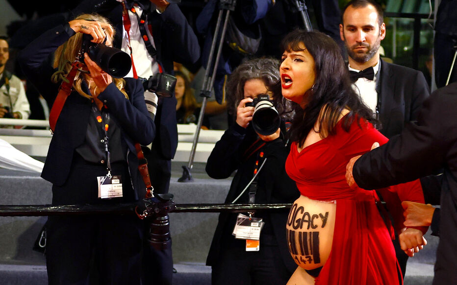Cette même femme s’était déjà introduite sur le tapis rouge en 2022 avec le buste recouvert d’une peinture aux couleurs du drapeau ukrainien et de la mention « stop raping us » (« arrêtez de nous violer »).