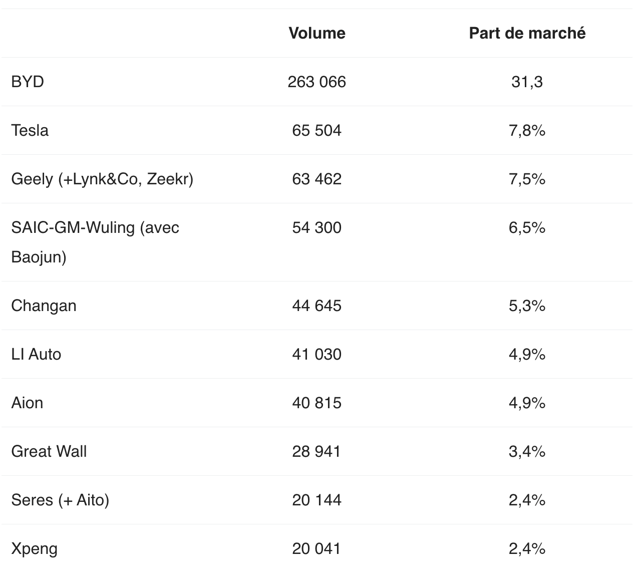 BYD domine le marché avec une part de 31,3%, suivie de près par Tesla. Mais Tesla fait face à une concurrence accrue de la part de constructeurs chinois ambitieux comme LI Auto, Geely, Aion, et Changan. LI Auto se distingue particulièrement avec plus de 40 000 unités vendues.