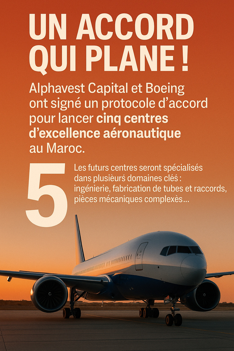 Alphavest Capital et Boeing ont signé un protocole d’accord pour lancer cinq centres d’excellence aéronautique (CEA) au Maroc. Ce partenariat vise à renforcer la compétitivité du secteur aéronautique national et à développer des capacités industrielles et logistiques avancées.