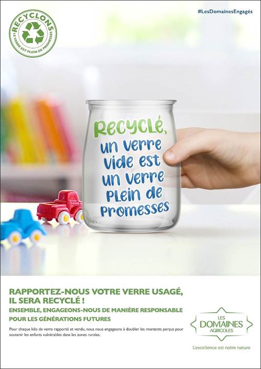 Les Domaines Agricoles, qui ont lancé en 2013 une opération environnementale et solidaire, à travers la collecte de leurs emballages en verre usagés, invitent leurs clients à renforcer ce geste éco-responsable. Les retombées financières de cette opération seront doublées par l’entreprise à l’instar des années précédentes, pour soutenir les enfants en zones rurales.