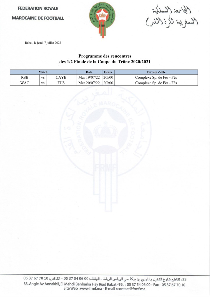 La première rencontre, qui opposera la RSB au CAYB se jouera mardi 19 juillet à 20H au complexe sportif de Fès. La deuxième opposant le WAC au FUS se jouera le mercredi 20 juillet à la même heure et sur le même stade.
