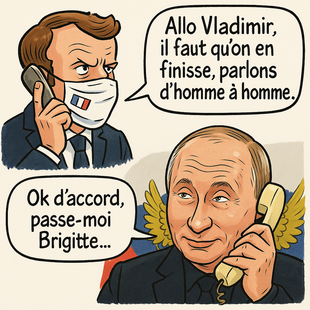 Dans cette caricature savoureuse, les codes de la virilité politique volent en éclats. Emmanuel Macron, le ton grave, tente de recadrer Vladimir Poutine par téléphone : « Parlons d’homme à homme ». La réponse du président russe est cinglante et pince-sans-rire : « Passe-moi Brigitte ». Une répartie qui tord le cou aux logiques de confrontation pour mieux moquer les ego surdimensionnés des chefs d’État. Humour noir, guerre des mots et joutes diplomatiques… bienvenue dans le théâtre absurde de la géopolitique contemporaine.