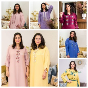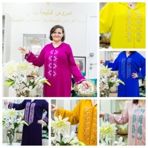 La broderie (trz) revient de plus belle en cette saison avec « zouak et maallam » : « trz tkhrag » fait à la machine, « trz rbati » fait main, yougoslave, « tounsi » ou point de croix donnant parfois l’effet de « randa ». De jolis motifs brodés sur des tissus de couleurs unies, pour relever le travail de l’artisan. Parmi les modèles de Mme Bennani, il y a aussi des jellabas travaillées en « randa », assemblées en perlage ou avec « randa » perlée (randa de laakik).