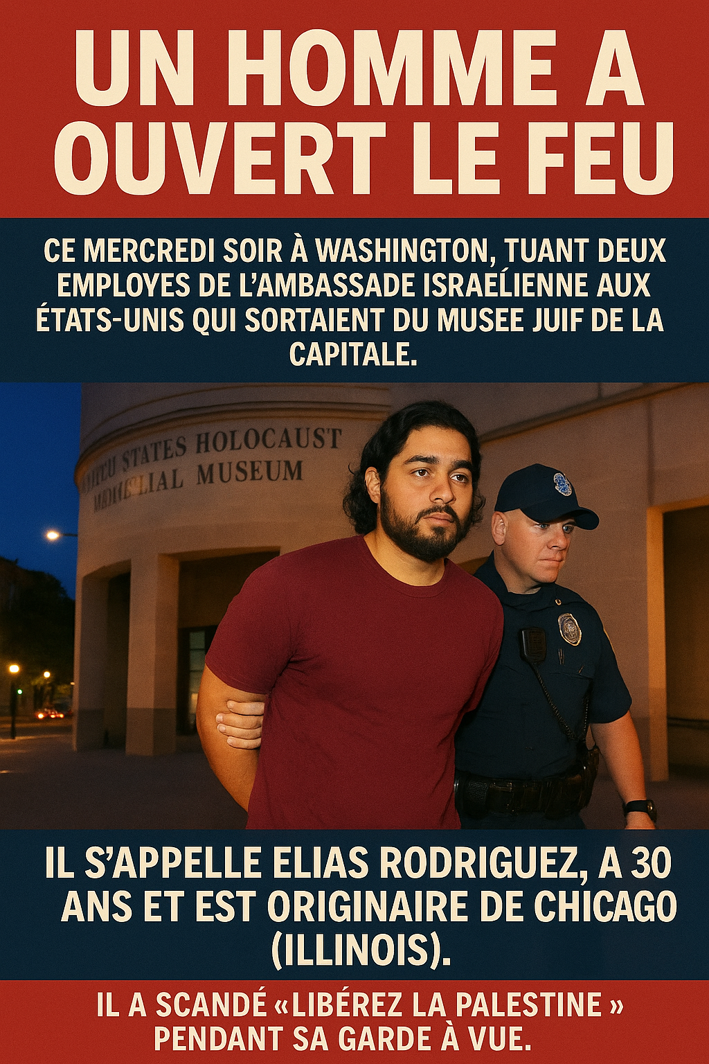 Un homme a ouvert le feu ce mercredi soir à Washington, tuant deux employés de l'ambassade israélienne aux Etats-Unis qui sortaient du musée juif de la capitale. Il s’appelle Elias Rodriguez, a 30 ans et est originaire de Chicago (Illinois). Il a scandé «Libérez la Palestine» pendant sa garde à vue.