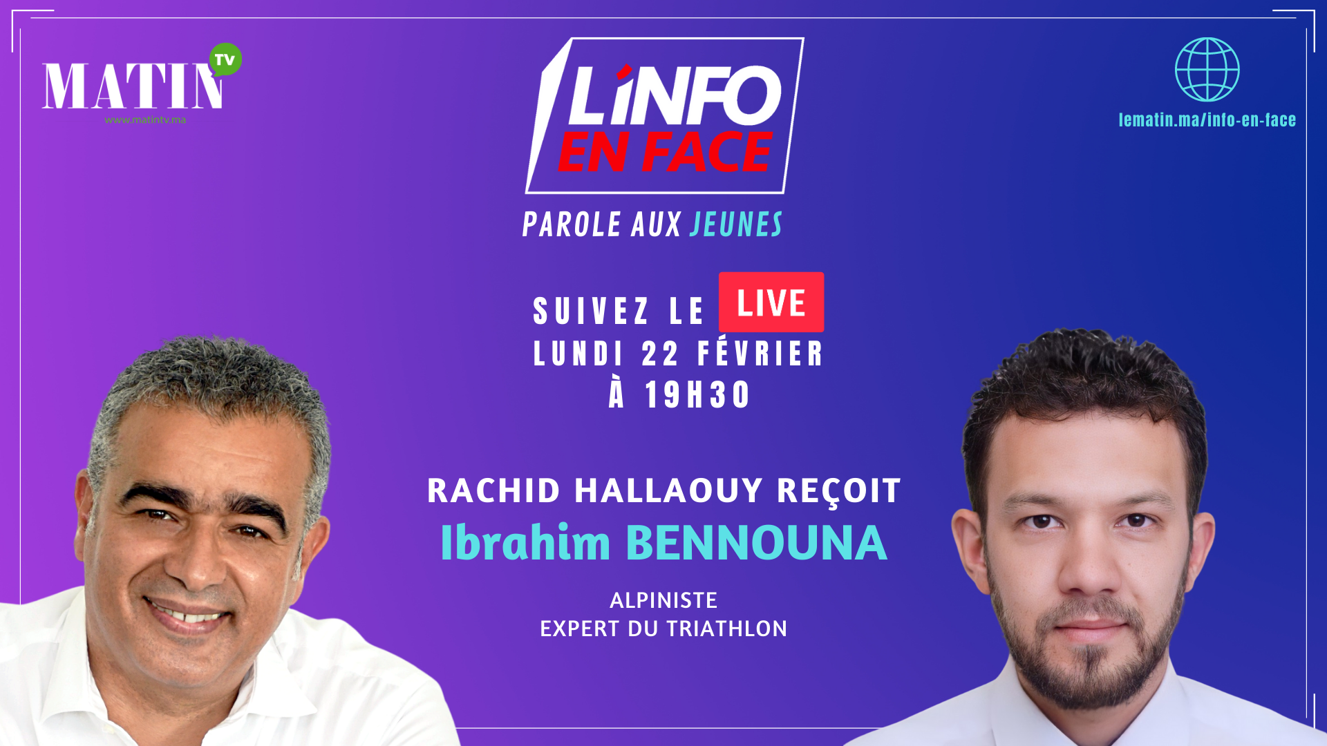 L'Info en Face donne la parole aux jeunes citoyens, engagés, pour savoir comment ils ont vivent la crise de la Covid-19 et quels sont leurs ambitions, projets et rêves d'avenir.... Pour ce podcast, Rachid Hallaouy donne la parole à Ibrahim Bennouna, Alpiniste- Expert du Triathlon