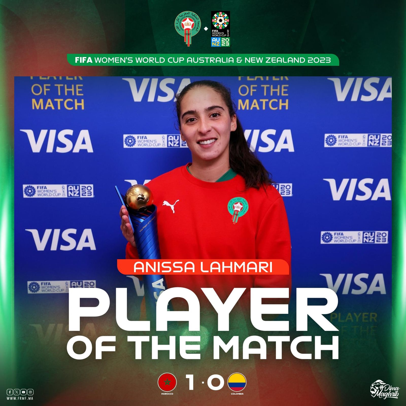 La joueuse marocaine Anissa Lahmari a été nommée meilleure joueuse du match ayant opposé, jeudi dernier, le Maroc à la Colombie (1-0) pour le compte de la 3e journée du groupe H de la Coupe du monde féminine de football.
