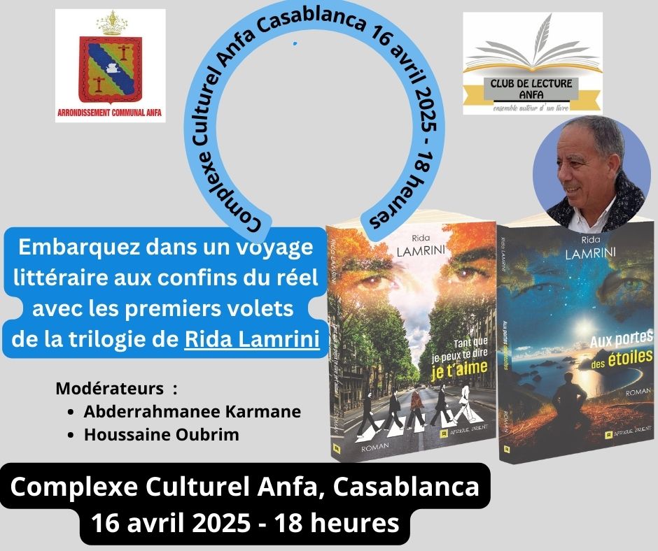 Le Club de Lecture Anfa et l’Arrondissement Communal Anfa vous invitent à un événement exceptionnel le mercredi 16 avril 2025 à 18h au Complexe Culturel Anfa, Casablanca.