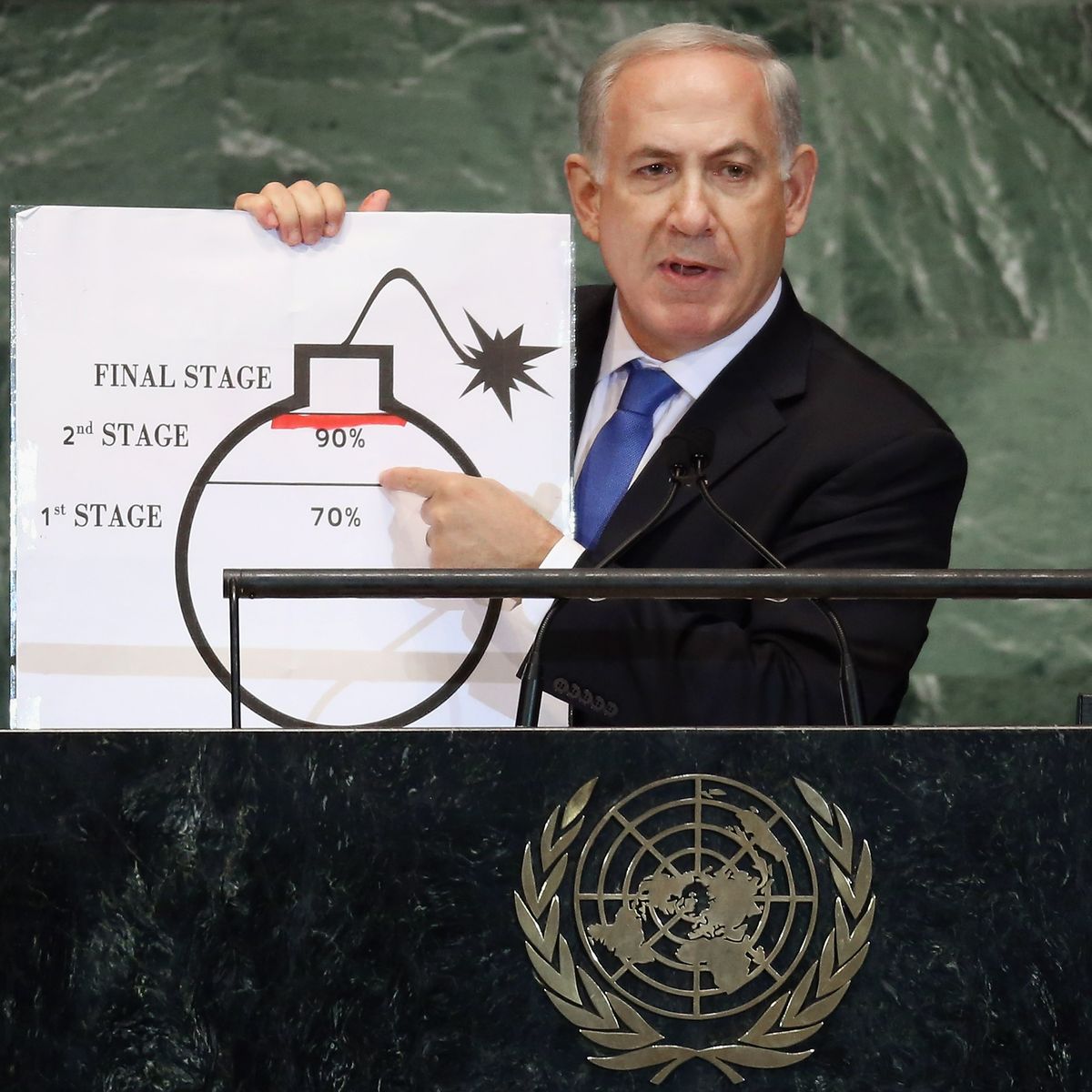 Le premier ministre israélien, Benjamin Netanyahou, dénonçant à la tribune de l'Onu le programme nucléaire iranien, le 27 septembre 2012