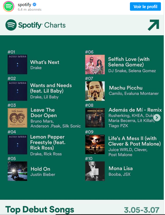 Dans une publication sur Instagram, la plateforme de musique en streaming Spotify a révélé son top 10 des meilleurs démarrages d’album.