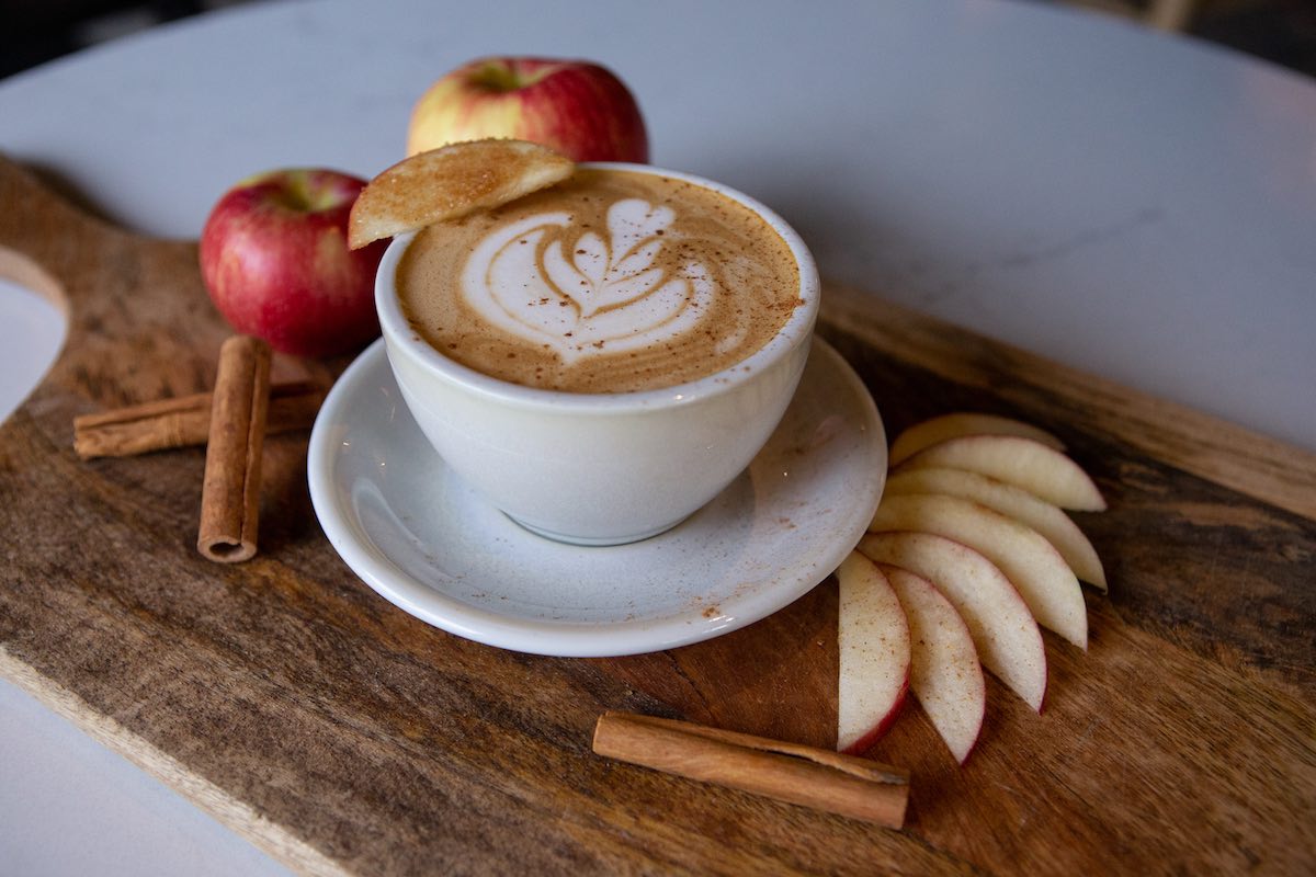 Les pommes fraîches sont abondantes en automne, et leur saveur sucrée et acidulée se marie merveilleusement bien avec le café. Un cappuccino aux pommes caramélisées est préparé en ajoutant une sauce à la pomme caramélisée et de la mousse de lait à un espresso.