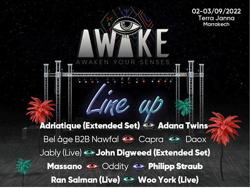 Awake Festival se donne également pour mission de promouvoir la culture et l’art inter-pays en invitant des artistes et Dj internationaux de différents pays et nationalités tels que Woo York, Ran Salman, Massano, John Digweed, Adana Twins, Philip straub, Oddity, Daox, Jably et bien d’autres encore.