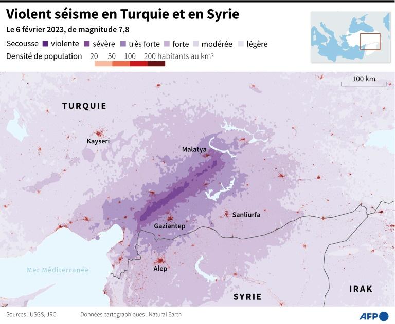 L'épicentre se situe dans la province de Kahramanmaras, à 60 km environ de la frontière syrienne. La zone s'étend sur un rayon de 500 kilomètres et concerne près de 25 millions de personnes côté turque , reparties sur dix grandes villes.