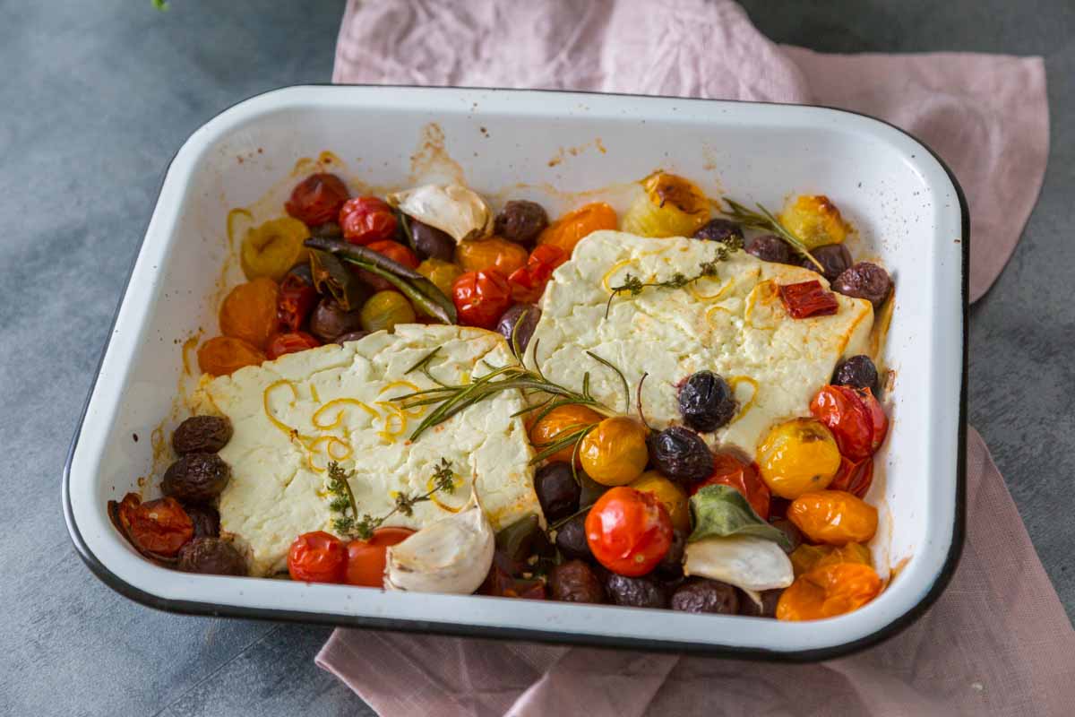 Mélangez le tout et ajoutez ensuite le bloc de feta au centre de votre plat.