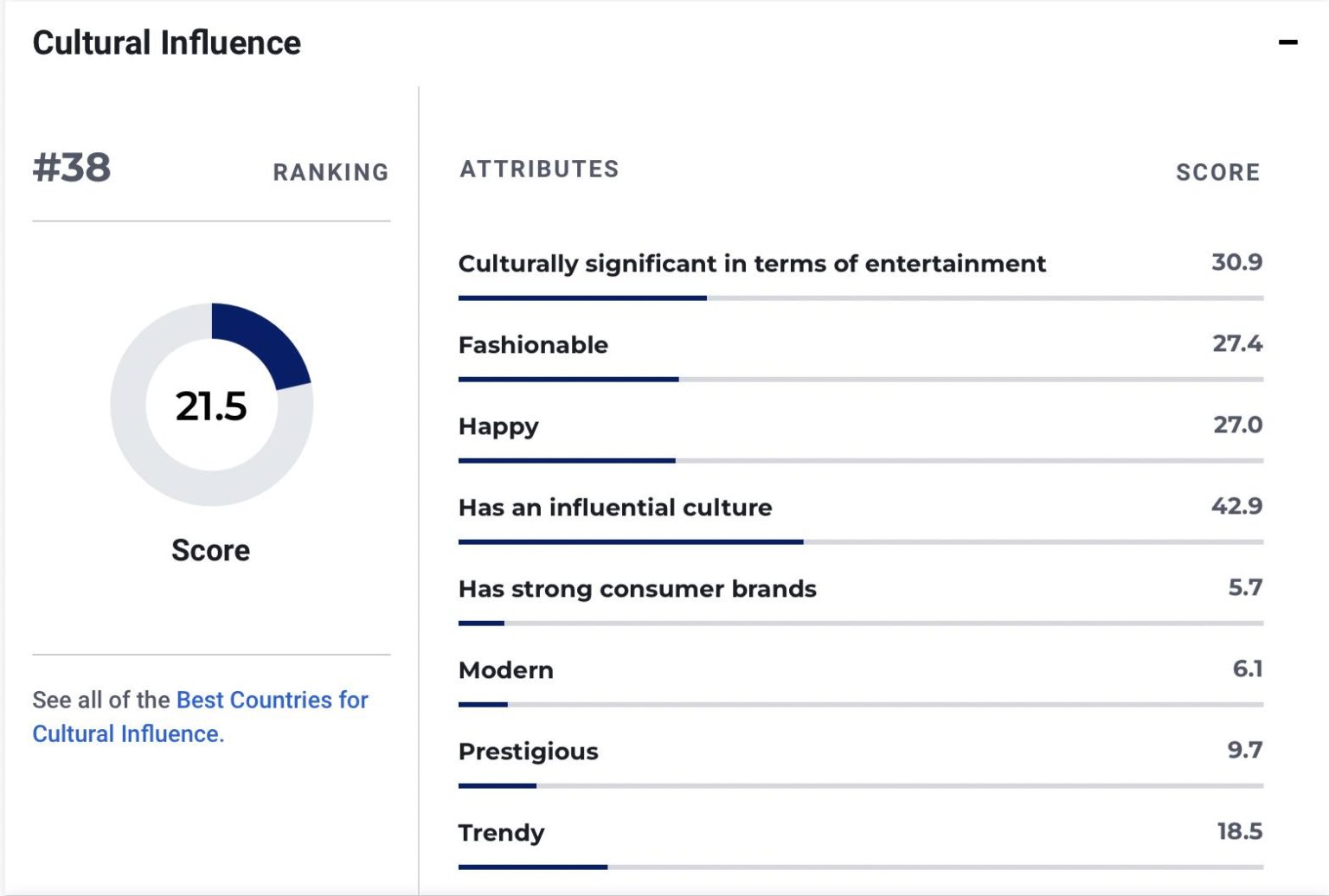 Ce classement mondial se base sur une moyenne des scores attribués, à chaque pays, sur des critères qui sont liés à son influence culturelle, parmi lesquels : le divertissement, la mode, la notion du bonheur, l'influence de la culture ou encore la puissance des marques.