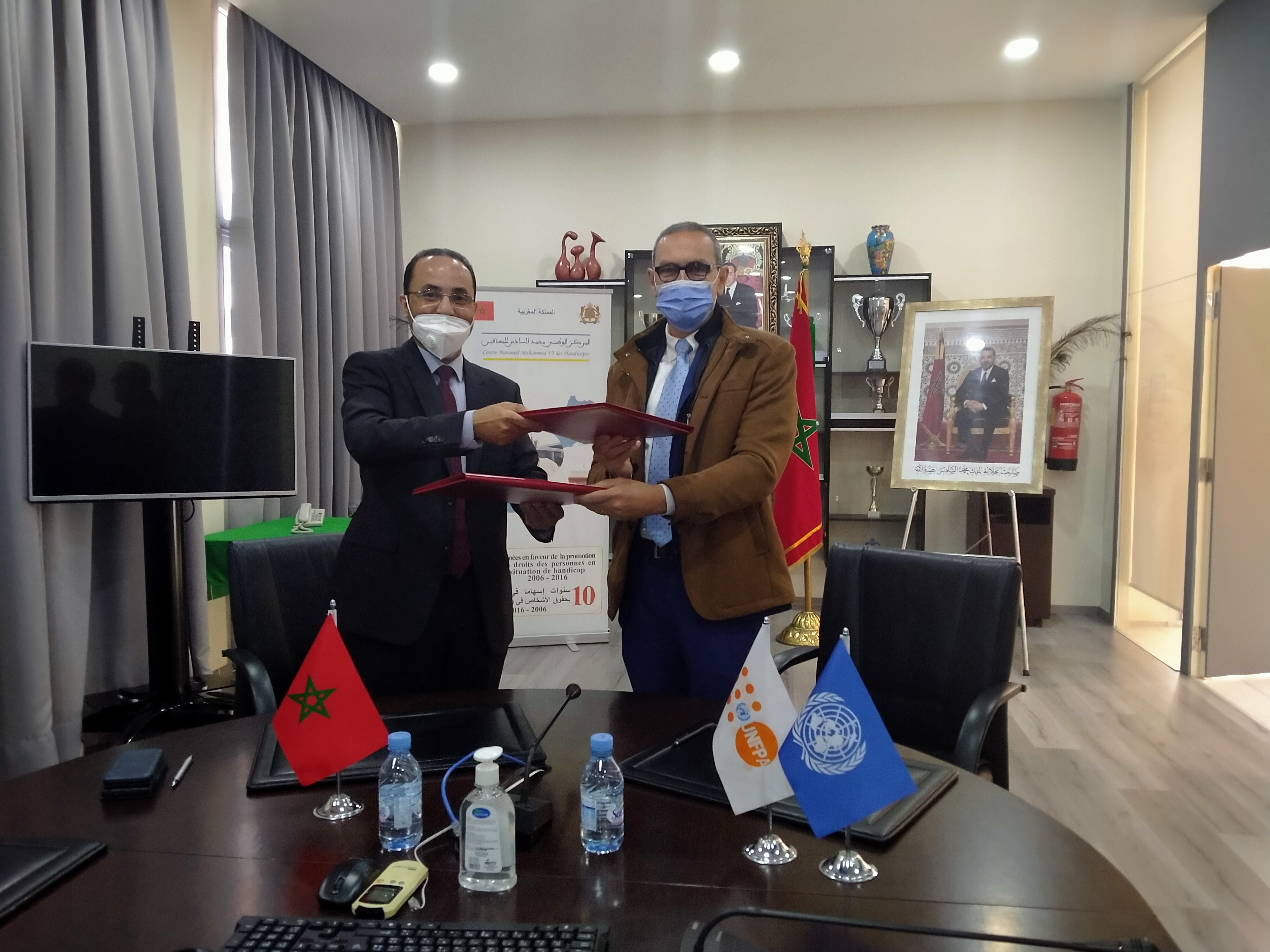 Monsieur Luis Mora, Représentant de UNFPA, Fonds des Nations Unies pour la Population au Maroc et Dr. Khalid Benhassan, Directeur du Centre National Mohammed VI pour les Handicapés (CNMH) ont signé aujourd’hui à Rabat un plan de travail annuel pour la promotion du bien-être des femmes, des adolescents et des jeunes en situation de handicap.