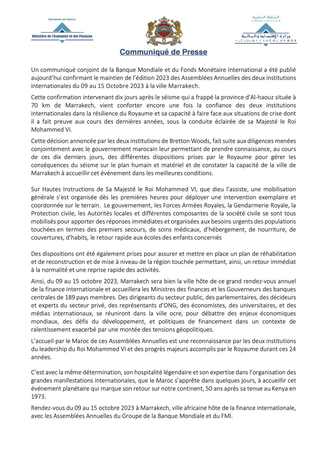 « Depuis le tremblement de terre dévastateur qui a frappé le Maroc le 8 septembre, les services de la Banque mondiale et du FMI ont travaillé en étroite coordination avec les autorités marocaines et une équipe d’experts pour évaluer de manière approfondie la capacité de Marrakech à accueillir les Assemblées annuelles 2023 », ont déclaré Ajay Banga, président de la Banque mondiale, Kristalina Georgieva, directrice générale du FMI, et Nadia Fettah Alaoui, ministre marocaine de l’Economie et des Finances, dans un communiqué conjoint.