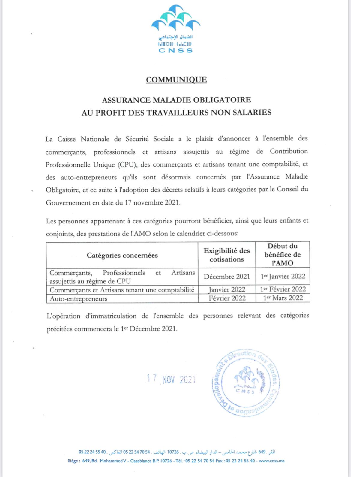 La Caisse Nationale de Sécurité Sociale a le plaisir d’annoncer à l’ensemble des commerçants, professionnels et artisans assujettis au régime de Contribution Professionnelle Unique (CPU), des commerçants et artisans tenant une comptabilité, et desauto-entrepreneurs qu’ils sont désormais concernés par l’Assurance Maladie Obligatoire, et ce suite à l’adoption des décrets relatifs à leurs catégories par le Conseil du Gouvernement en date du 17 novembre 2021.