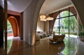 Une enveloppe ponctuée curviligne entoure la maison, créant des espaces interstitiels semi-ouverts tout le long du périmètre, avec des renfoncements plus profonds sur les côtés donnant sur le jardin. Cette enveloppe réduit considérablement le gain de chaleur, tout en offrant des espaces ouverts abrités autour de la maison à chaque pièce.