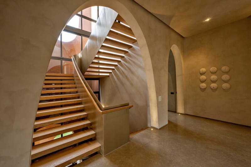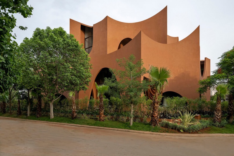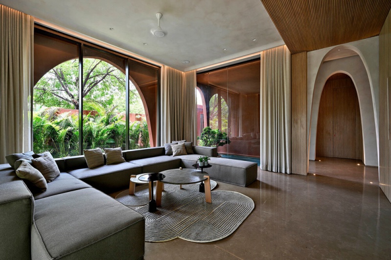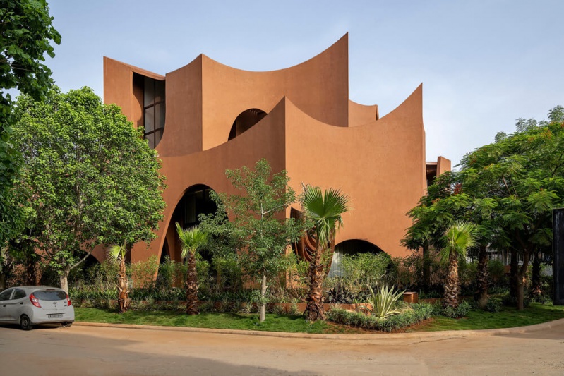 Cette maison sculpturale est contextuelle à son environnement, au climat et aux besoins du propriétaire, ce qui donne un jeu intéressant de volumes, d'espaces ouverts, fermés et semi-fermés à tous les niveaux. La conception crée des espaces économes en énergie avec un gain de chaleur réduit et une lumière naturelle indirecte dans chaque partie de la maison.