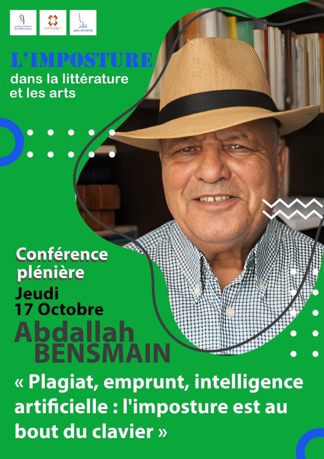 La Faculté des Langues, Lettres et Arts -Kénitra (Université Ibn Tofail) organise un Colloque International sur l'imposture dans la littérature et les arts, mercredi et jeudi 16 et 17 octobre 2024 auquel je suis invité à donner une conférence plénière sur le plagiat, l’emprunt et l’intelligence artificielle, sous le titre :