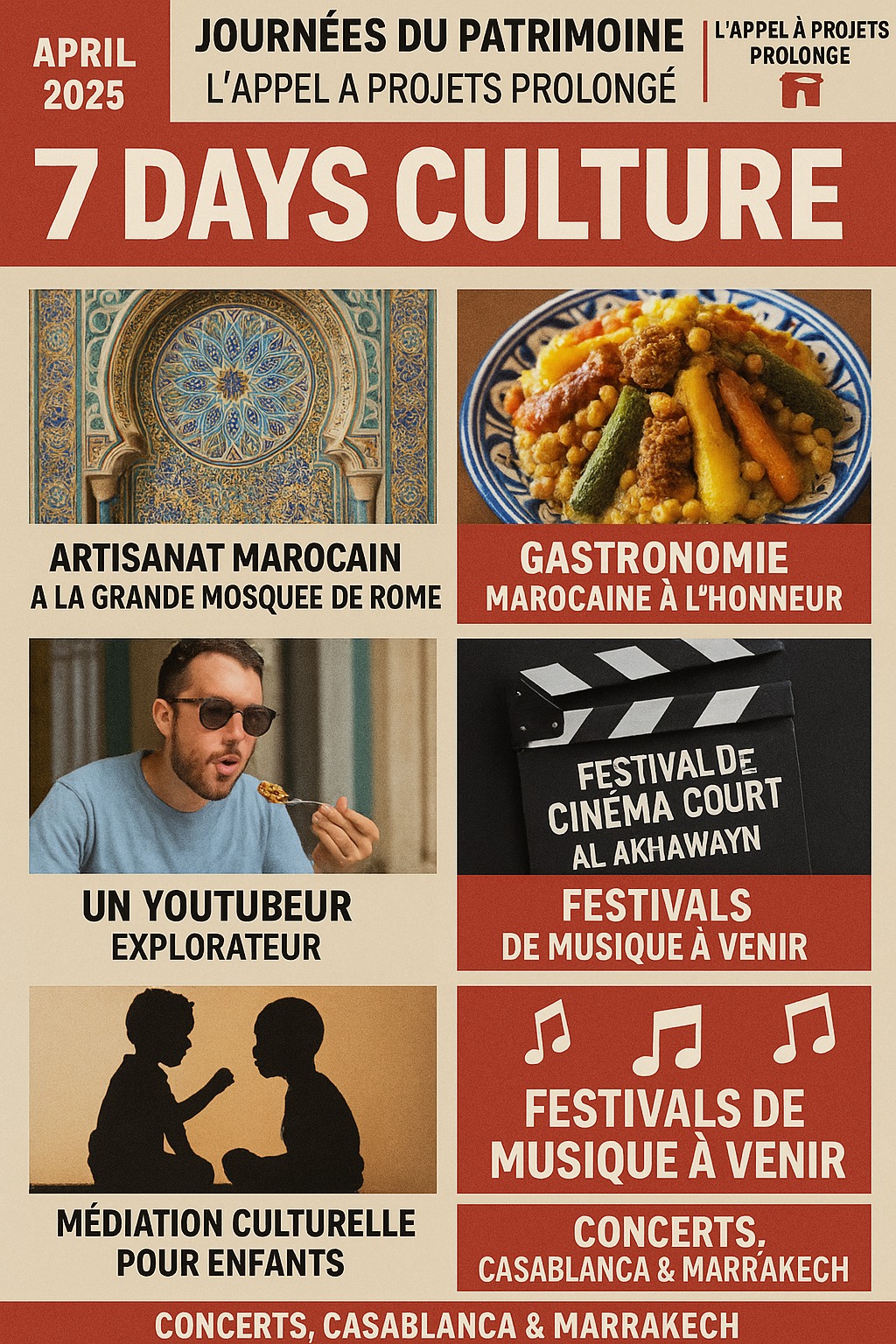 Ces extraits d'un magazine culturel marocain, "7 Days Culture" daté du 2 avril 2025, offrent un aperçu des divers aspects de la culture marocaine. Ils mettent en lumière l'artisanat marocain à travers la décoration de la Grande Mosquée de Rome et rendent hommage à la richesse de la gastronomie marocaine, récemment reconnue mondialement et explorée par un célèbre Youtubeur. Le magazine relate également des événements culturels tels que le festival de cinéma court d'Al Akhawayn et des concerts à venir, témoignant du dynamisme culturel du pays. De plus, il annonce la prolongation d'un appel à projets pour les Journées du patrimoine de Casablanca et une initiative de médiation culturelle pour les enfants. Enfin, il informe sur le lancement de nouvelles éditions de festivals de musique à Casablanca et Marrakech, enrichissant l'offre culturelle marocaine.