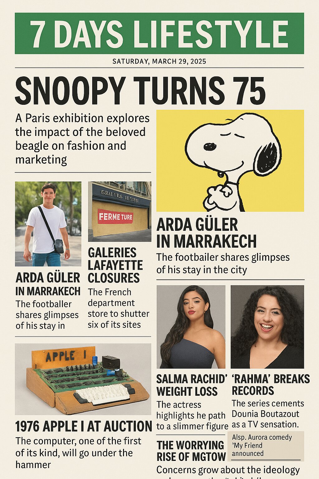 Ce numéro de 7 Days Lifestyle explore divers aspects de la culture et du style de vie. Un article central célèbre le 75ème anniversaire de Snoopy, retraçant son impact sur la mode et le marketing à travers une exposition parisienne. Le magazine aborde également des sujets d'actualité, comme le séjour à Marrakech du footballeur Arda Güler, la fermeture de certaines Galeries Lafayette, et la démarche de perte de poids de l'actrice Salma Rashid. Une vente aux enchères d'un ordinateur Apple I de 1976 est mentionnée, soulignant son importance historique. Le magazine s'intéresse aussi au cinéma et à la télévision marocains, évoquant le succès de la série «Rahma» et la popularité de l'actrice Dounia Boutazout, tout en annonçant une nouvelle comédie, «My Friend». Enfin, le journal examine le mouvement masculiniste MGTOW, soulevant des inquiétudes quant à son idéologie et ses potentielles dérives.