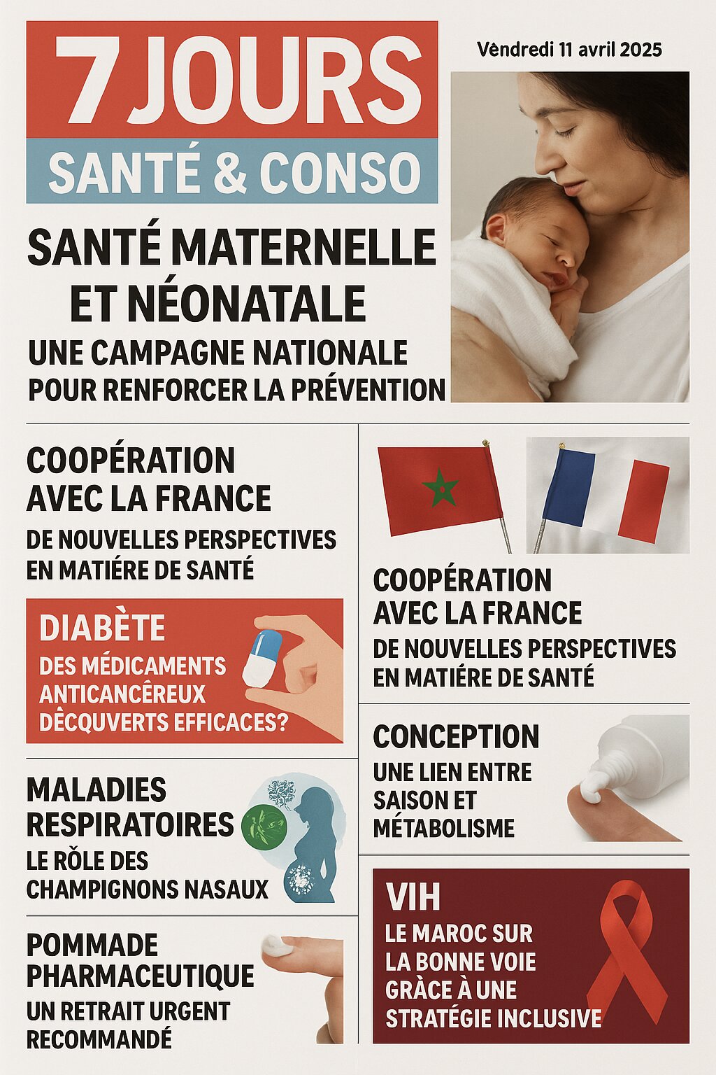 Ces sources de la publication 7 Jours Santé & Conso du 11 avril 2025 mettent en lumière diverses actualités marocaines et internationales liées à la santé et à la consommation. Elles soulignent notamment les efforts du Maroc pour renforcer la santé maternelle et néonatale à travers une campagne nationale et une coopération accrue avec la France dans le domaine de la santé. Le journal aborde également des sujets tels que la découverte de médicaments anticancéreux potentiels contre le diabète, le rôle des champignons nasaux dans les maladies respiratoires, l'influence de la saison de conception sur le métabolisme, et le retrait urgent d'une pommade pharmaceutique. Enfin, il met en avant les progrès significatifs du Maroc dans la lutte contre le VIH grâce à une stratégie inclusive.