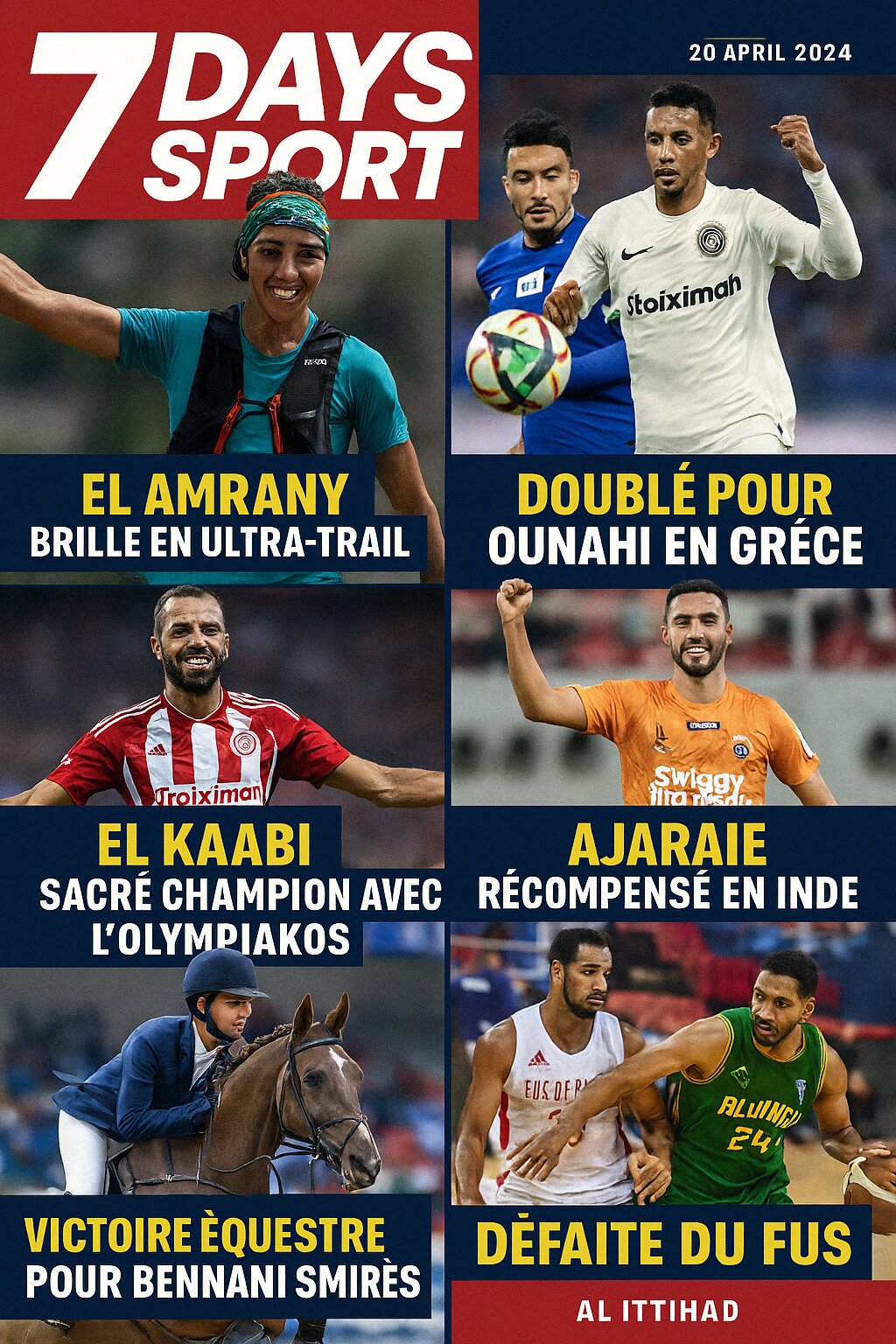 Ce numéro de 7 Days Sport met en lumière plusieurs réussites d'athlètes marocains, notamment la performance en ultra-trail d'Aziza El Amrany et le doublé d'Azzedine Ounahi en Grèce. Le podcast relate également la victoire d'Ayoub El Kaabi en championnat grec et le titre de meilleur joueur et buteur d'Alaeddine Ajaraie en Inde. Par ailleurs, l'émergence du jeune Abdel Ouazzane en football et la victoire équestre d'Abdeslam Bennani Smires sont soulignées. Enfin, le podcast sportif couvre la défaite du FUS de Rabat en basketball face à Al Ittihad.