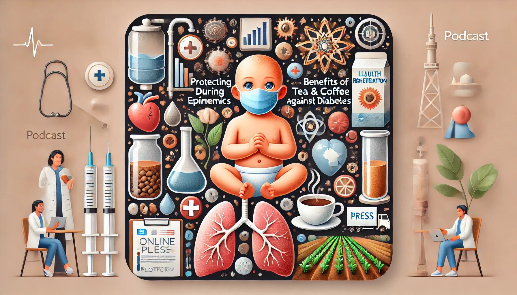 Ce podcast de presse aborde plusieurs sujets de santé : la protection des bébés durant les épidémies, notamment en évitant les baisers sur le visage; la régénération pulmonaire après l’arrêt du tabac; les origines prénatales possibles de la schizophrénie; les bienfaits du thé et du café contre le diabète; la lutte contre la rougeole au Maroc; et la gestion des cultures gourmandes en eau. Il inclut aussi des conseils pour préparer son corps au jeûne du Ramadan et une interview sur le daltonisme. Enfin, il mentionne une plateforme de presse en ligne.