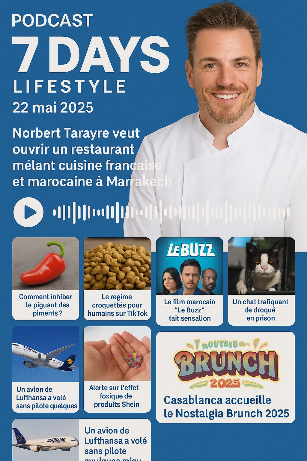 Ce podcast en date du 22 mai 2025 de 7 DAYS LIFESTYLE rassemble plusieurs sujets. Un podcast principal met en avant le chef Norbert Tarayre et son projet d'ouvrir un restaurant fusionnant cuisine française et marocaine à Marrakech. La publication inclut également des brèves couvrant des découvertes sur la neutralisation du piquant des piments, le régime atypique d'un influenceur TikTok surnommé "croquettes pour humains", le succès du film marocain "Le Buzz", un incident insolite impliquant un chat trafiquant de drogue en prison, les dangers potentiels de produits chimiques dans des articles pour enfants de la marque Shein, et un couple s'étant marié dans le jeu vidéo Minecraft. Un autre podcast détaille l'incident d'un avion Lufthansa qui a volé sans personne aux commandes pendant plusieurs minutes à cause du malaise du copilote. Enfin, le podcast annonce le Nostalgia Brunch 2025 à Casablanca, un événement célébrant la culture hispano-andalouse avec musique et gastronomie.