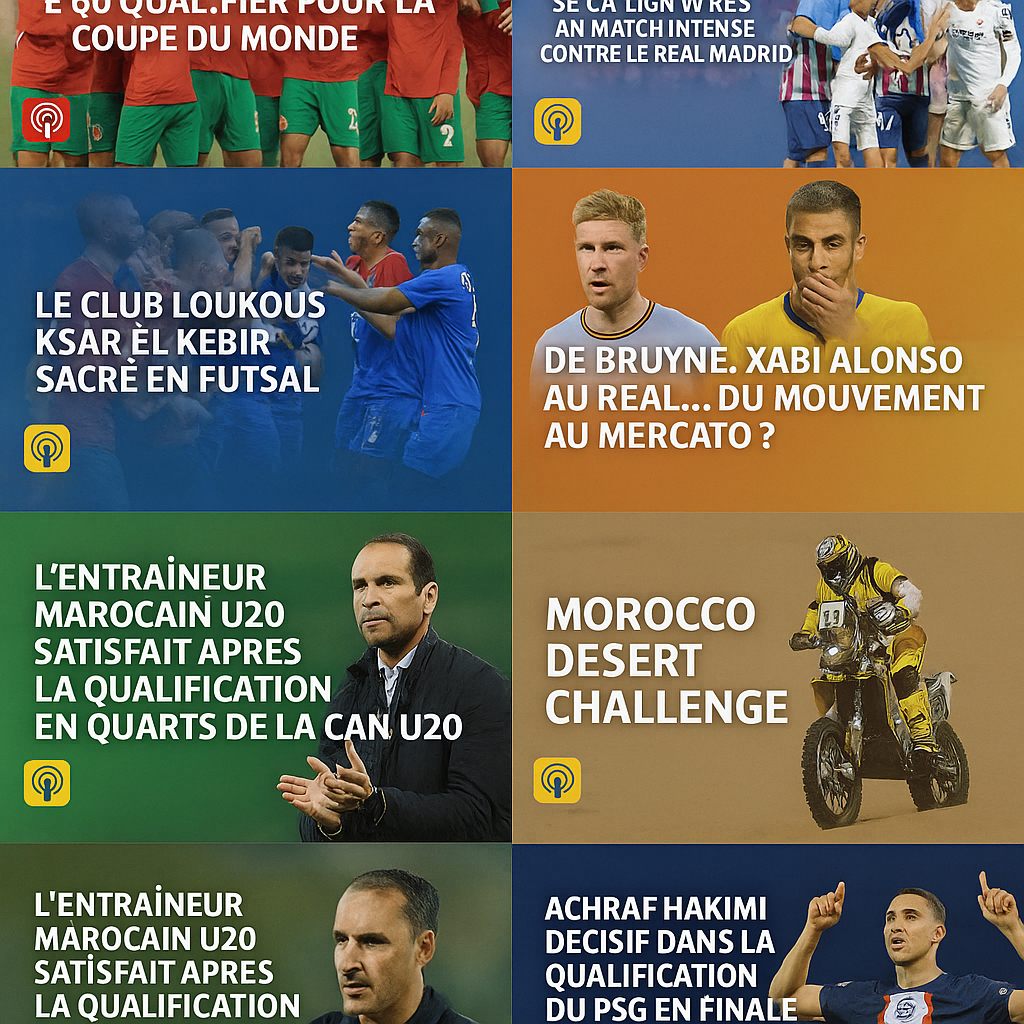 Cette collection de podcasts sportifs couvre plusieurs sujets importants, notamment l'objectif de la sélection marocaine U20 de se qualifier pour la Coupe du monde, le FC Barcelone remportant le titre de champion de la Liga après un match intense contre le Real Madrid, et la performance notable mais entachée d'une expulsion d'Abderrazak Hamdallah en Saudi Pro League. D'autres podcasts sportifs incluent le sacre du Club Loukous Ksar El Kebir en futsal, les rumeurs de transfert concernant Kevin De Bruyne et l'arrivée supposée de Xabi Alonso au Real Madrid, le Morocco Desert Challenge, la satisfaction de l'entraîneur marocain U20 après la qualification pour les quarts de finale de la CAN U20, et le rôle décisif d'Achraf Hakimi dans la qualification du PSG pour la finale de la Ligue des Champions.