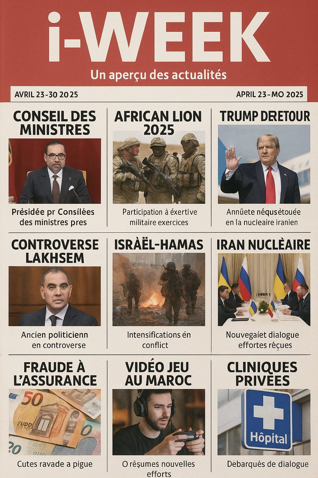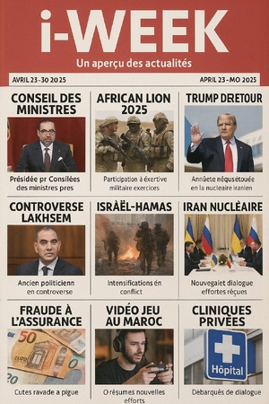 Ce numéro d'I-Week offre un aperçu des actualités nationales et internationales, incluant un Conseil des ministres présidé par le Roi Mohammed VI axé sur des projets de loi, des conventions internationales et des nominations. Il couvre également la participation du Maroc à l'exercice militaire African Lion 2025 et la controverse autour de l'ancien homme politique Mustafa Lakhsem. Sur la scène mondiale, on retrouve le retour médiatisé de Donald Trump au Moyen-Orient, l'escalade du conflit entre Israël et le Hamas, les progrès dans les négociations sur le nucléaire iranien, et des pourparlers entre l'Ukraine et la Russie à Istanbul. Des sujets variés comme la fraude à l'assurance, le développement de l'industrie du jeu vidéo au Maroc, et les défis des cliniques privées y sont aussi abordés.