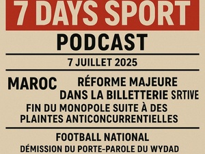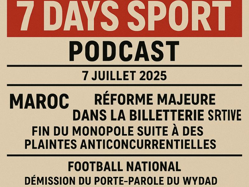 Le podcast du 7 DAYS SPORT du 7 juillet 2025, offre un aperçu des actualités sportives au Maroc, incluant une réforme majeure dans la billetterie sportive qui met fin à un monopole, suite à des plaintes pour pratiques anticoncurrentielles. On y trouve également des brèves sur le football national, telles que la démission d'un porte-parole du Wydad, la stratégie du Maroc pour le Mondial 2030, et les sanctions financières pour des clubs de Botola. Des nouvelles sur d'autres sports comme le golf et les sports équestres sont aussi abordées.