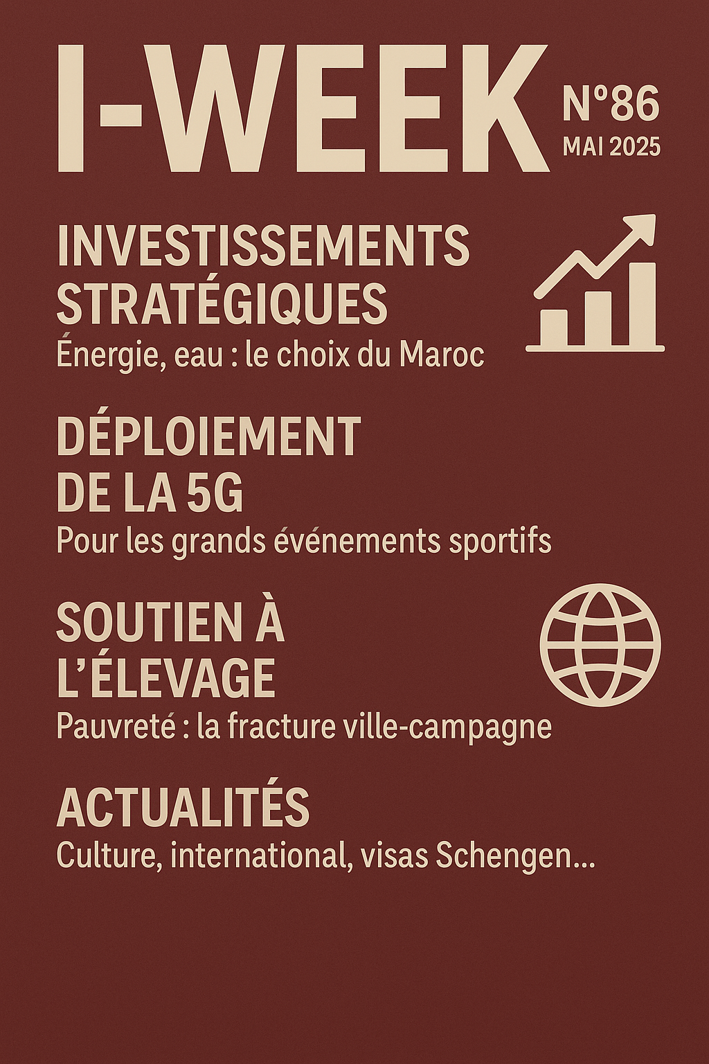 Cette édition de l'I-WEEK N°86 - MAI 2025, couvre divers sujets. Il présente des articles sur les investissements stratégiques du Maroc, notamment dans l'énergie et l'eau, ainsi que le déploiement de la 5G pour des événements sportifs majeurs. On y trouve aussi un aperçu des efforts visant à soutenir le secteur de l'élevage et une analyse de la réduction de la pauvreté, bien que la disparité entre zones urbaines et rurales persiste. De plus, il aborde des actualités culturelles et internationales, incluant la position du Maroc sur la scène africaine et les défis de la mobilité internationale, comme l'obtention de visas Schengen.