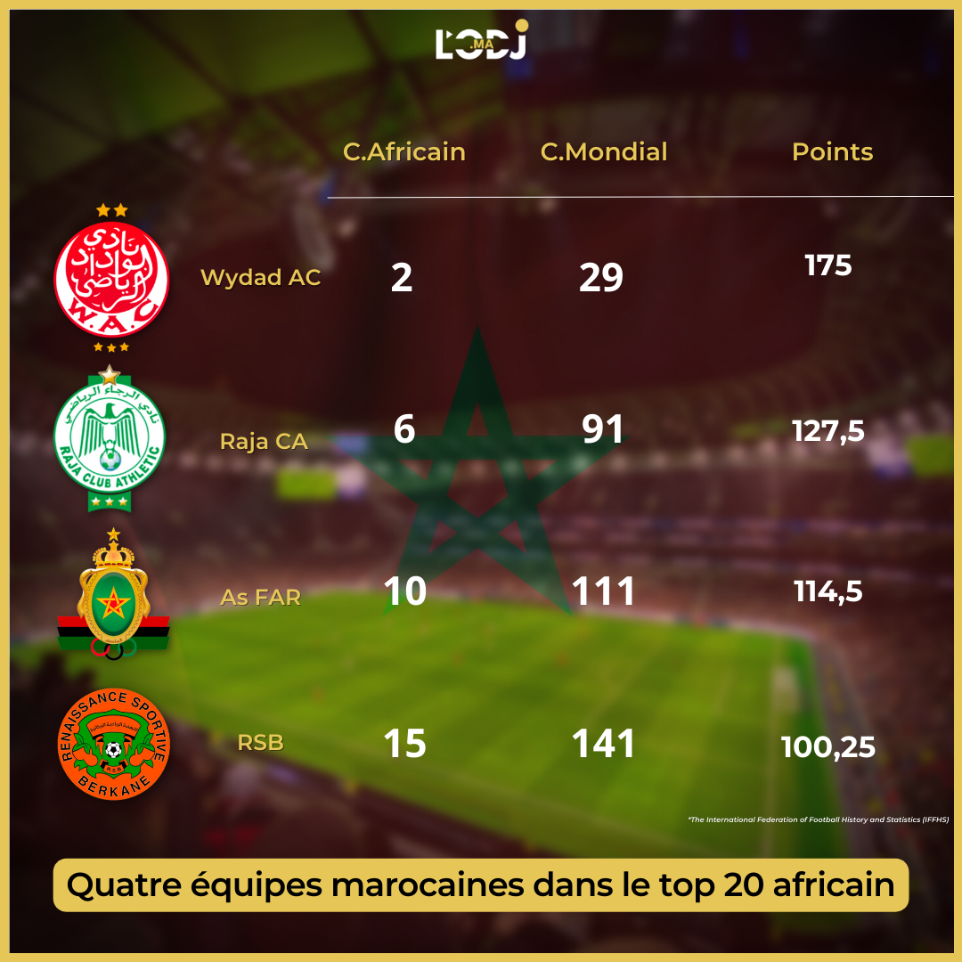 Quatre équipes marocaines dans le top 20 africain