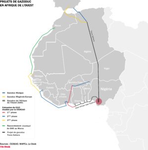 (*) Les 14 pays reliés par le futur gazoduc Nigéria-Maroc sont : le Nigéria, le Bénin, le Togo, la Guinée équatoriale, le Ghana, la Côte d’Ivoire, le Liberia, le Sierra Leone, La Guinée-Conakry, la Guinée-Bissau, la Gambie, le Sénégal, la Mauritanie et le Maroc.