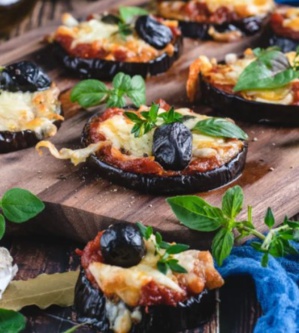 Préchauffez le four à 180°C. Lavez puis coupez les aubergines en rondelles d’environ 1cm d’épaisseur. Disposez-les sur la plaque du four recouverte de papier sulfurisé. Arrosez d’un filet d’huile d’olive et enfournez 10 mn à 180°C pour les précuire. Sortez les aubergines et étalez la sauce tomate sur les rondelles. Disposez la garniture, la mozzarella et parsemez d’herbes fraiches. Enfournez 20mn.